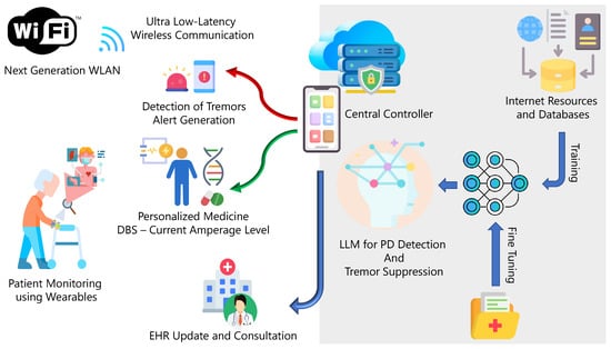 - Cardenas, L.; Parajes, K.; Zhu, M.; Zhai, S. AutoHealth: Advanced LLM-Empowered Wearable Personalized Medical Butler for Parkinson’s Disease Management. In Proceedings of the 2024 IEEE 14th Annual Computing and Communication Workshop and Conference (CCWC), Las Vegas, NV, USA, 8–10 January 2024; pp. 375–379. [Google Scholar] [CrossRef]