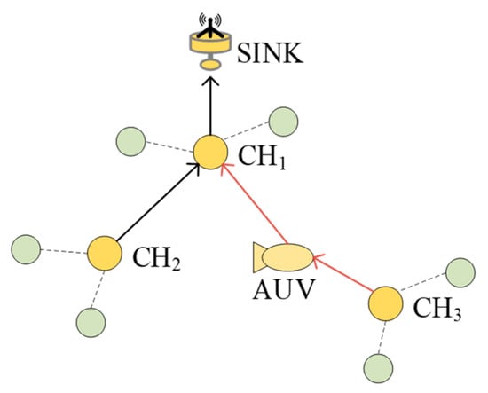 Owing to the limited communication distance between CHs, there may be situations where some CHs cannot communicate directly. For example, in Figure 3, and cannot communicate directly owing to the long distance, and this situation will greatly reduce the network transmission efficiency. To solve this problem, this paper introduces AUV assistance, which allows the AUV to act as a dynamic relay node to relay messages from CHNs, thus improving transmission efficiency and network performance.