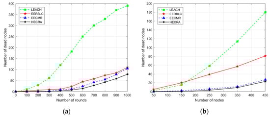 Figure 5b shows the number of dead nodes for a transmission range of 150 m and a varying number of sensor nodes between 50 and 450, where the number of sensor nodes is varied every 1000 rounds of operation. The graphical results show that the average number of dead nodes in HECRA is reduced by 0.8%, 12.87%, and 20.18% compared to that in EECMR, EERBLC, and LEACH, respectively, for varying numbers of nodes, where LEACH performs the worst in terms of the number of node deaths because all the nodes are randomized to become CHs sequentially in this protocol, which leads to unbalanced energy consumption. The EERBLC achieves more balanced energy consumption by optimizing the cluster head selection considering the node degree and residual energy; hence, the number of node deaths is lower than that of the LEACH algorithm. EECMR stratifies the network based on depth on the basis of CH selection and introduces relay nodes to reduce energy consumption further; hence, the number of node deaths is lower. HECRA is optimized for the CH data at the data transmission stage for multihop transmission, and dynamic relay nodes are introduced to save energy more effectively; hence, the number of node deaths is slightly lower than that of EECMR.