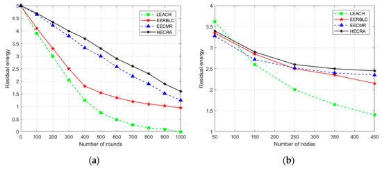 To evaluate the residual energy of the HECRA nodes in different network environments, experiments are conducted in this paper with different numbers of nodes and different transmission ranges.
