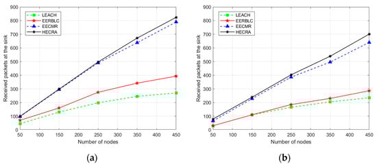 Figure 7a,b show the number of successful packet transmissions when the transmission range is 200 m and 150 m, respectively, with the number of sensor nodes varying between 50 and 450 and the number of sensor nodes varying every 1000 rounds of operation. From the graphical results, it can be seen that when the transmission range decreases, the number of successful packet transmissions for the four protocols also decreases, while HECRA still shows better performance overall; as the number of nodes varies, the number of successful packet transmissions for a transmission range of 200 m compared to EECMR, EERBLC, and LEACH is improved by 2.61%, 42.89%, and 58.47%, respectively. The number of successful packet transmissions for a transmission range of 150 m is improved by 6.8%, 45.17%, and 47.82% compared to that of EECMR, EERBLC, and LEACH, respectively. This is mainly because HECRA introduces an AUV as a dynamic relay node, which enables it to effectively assist in data transmission when the CH is unable to communicate. As a result, HECRA significantly improves the success rate of packet transmission and enhances the throughput and stability of the network.
