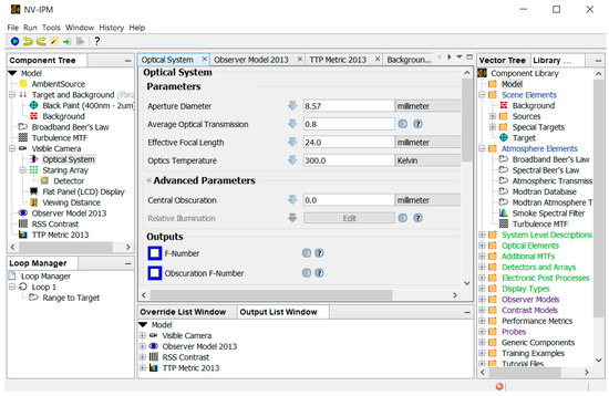 In this study, we fit the perception test results to the TTP metric model with the help of the Night Vision Integrated Performance Model (NV-IPM) [9], a software developed by the U.S. Army’s Night Vision and Electronic Systems Directorate (NVESD). It helps calculate metrics such as TTP and estimate human probability of detection for a given system, environment, observer model, and task difficulty. We employed a combination of pre-existing NV-IPM models to obtain TTP values for NIR and LWIR as a function of range. The models include the target and background model, broadband Beer’s law for atmospheric transmission and scattering, imaging optic, sensor, constant gain level, Root Sum of Squares (RSSs) contrast, display, observer, and TTP metric model. Figure 1 shows a snapshot of the NV-IPM software version 1.10 when modeling for the NIR imaging system.