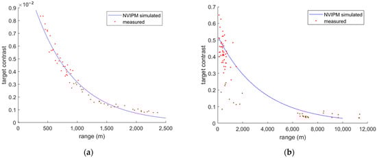 Figure 5 plots the contrast in the images between the target and background for LWIR and NIR compared with NV-IPM simulations (with settings detailed in Section 3.4). A region of interest (ROI) is selected around a clear (i.e., uncluttered) portion of each tower under cloud background; the box is sized to include at least twice as many background pixels as tower pixels. Then, tower contrast is calculated for the raw images using Equation (2), the same equation that the NV-IPM uses.