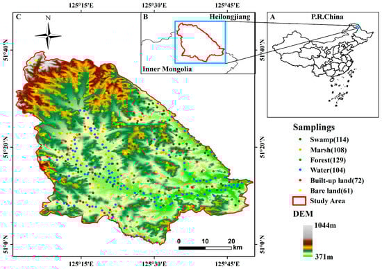 NWR was established in the cold, temperate forest zone of Northeast China. It is located at the border of Heilongjiang Province and the Inner Mongolia Autonomous Region, between 50°59′–51°39′ N and 125°01′–125°50′ E (Figure 1). The terrain is characterized by higher elevations in the north and west and lower elevations in the south and east, with altitudes ranging from 370 to 1044 m above sea level [34]. The average annual temperature is −3 °C, and the annual rainfall is approximately 500 mm [35]. NWR is a significant part of the Nenjiang River system and is one of the largest forest–swamp areas in China, playing a crucial role in wetland ecological research and conservation.