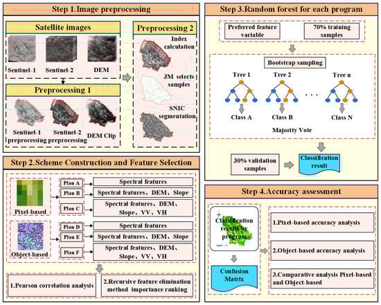 The aim of our study was to achieve high-precision extraction of land cover information in the wetland reserve. Our specific workflow is illustrated in Figure 2 and includes the following processes: (1) an in-depth analysis of the spectral characteristics, terrain features, and radar features of various land cover types; (2) the establishment of information extraction schemes, based on both pixel and object modes, initially utilizing only spectral bands and indices and subsequently integrating terrain features and radar features (Pearson correlation analysis and recursive feature elimination (RFE) were used to select the feature variables for each scheme, and RF was employed to perform land cover information extraction in both the pixel and object modes); and (3) a comparative analysis of the advantages of different schemes in extracting various land cover types. Detailed information about the schemes is provided in Table 2.