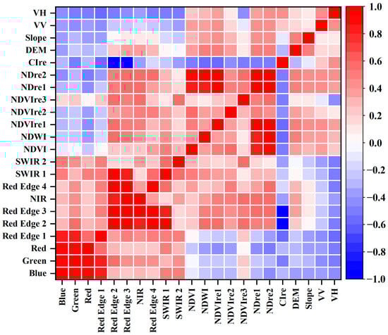 Figure 3 displays the correlation analysis results between various feature variables. Shades of red indicate a more positive correlation, and shades of blue indicate a more negative correlation, with the intensity of the color representing the strength of the correlation. A correlation coefficient greater than 0.8 is considered a strong correlation. The analysis revealed strong correlations between Blue and Green, as well as Red and Red Edge 1. Similarly, Green was highly correlated with Red and Red Edge 1. Red Edge 2 showed strong correlations with Red Edge 3, NIR, Red Edge 4, SWIR 1, and CIre, while Red Edge 3 strongly correlated with NIR, Red Edge 4, SWIR 1, and CIre. Additionally, NDre1 was strongly correlated with NDVI, NDWI, and NDVIre1, and NDre2 exhibited similar strong correlations with these indices. Due to the relatively close wavelengths and similar spectral characteristics, there was strong correlation between the visible bands and the red-edge bands. To reduce multicollinearity, the highly positively correlated bands Blue, Green, Red Edge 2, and Red Edge 3 were excluded. The red-edge indices were constructed based on red-edge bands, utilizing similar spectral bands in their calculation, leading to similar trends when monitoring vegetation or water bodies and resulting in correlation. Therefore, the highly positively correlated indices NDre1 and NDre2 were excluded from the feature variables.