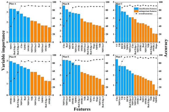 The variable importance measures in descending order and the average overall accuracy of different feature combinations of each Plan.
