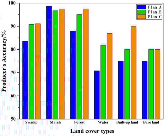 For the pixel-based schemes, Plan A, Plan B, and Plan C achieved overall accuracies of 86.29%, 91.61%, and 93.55%, respectively. Notably, the accuracy of Plan C increased by 7.26% when terrain and radar features were incorporated. Figure 5 shows that, among the three pixel-based schemes, the classification accuracy of marshes did not improve with the addition of terrain and radar data (see Plans B and C). Instead, the use of optical data was most effective for extracting marsh-related information (Plan A). For other land cover types, the inclusion of terrain data (Plan B) improved classification accuracy, especially for water bodies and forest cover. The combination of optical data and terrain features facilitated the extraction of information for swamps, forests, water bodies, built-up land, and bare land, with the best results for built-up land achieved through this combination. When radar data were further added (Plan C), the combination of optical data, terrain features, and radar features further enhanced the information extraction process for most types (aside from marshes and bare land). This combination significantly improved the classification accuracy for water bodies and built-up land. However, the improvement for other types was not as pronounced compared to Plan B.