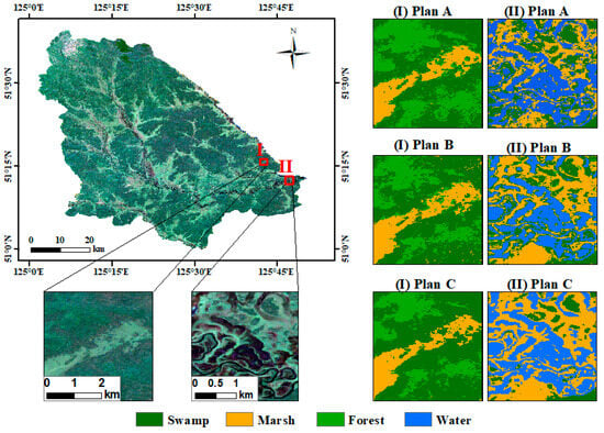 Figure 6 presents a detailed comparison of the results from the three pixel-based schemes. In Plans A and B, the patches of swamps, marshes, and forests were relatively fragmented, leading to a noticeable “salt-and-pepper” effect and some misclassification of swamps and forests. By contrast, Plan C markedly reduced misclassification and the “salt-and-pepper” effect. Marshes were depicted more uniformly and were predominantly found around the edges of swamps in flat terrain, offering a closer alignment with their actual distribution.
