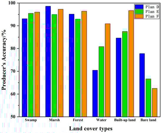 For the object-based schemes, Plans D, E, and F achieved overall accuracies of 91.25%, 92.23%, and 95.59%, respectively. Notably, the accuracy of Plan F improved by 4.34% when terrain and radar features were integrated. As shown in Figure 7, among the three object-based schemes, the classification accuracies for swamps, water bodies, and built-up land improved with the inclusion of terrain and radar data (Plans E and F). The combination of optical features, topographic features, and radar features was most effective for extracting information on swamps, water bodies, and built-up land (Plan F), and using this combined approach also yielded optimal results for forest extraction. However, the classification accuracies for marshes, forests, and bare land did not improve with the addition of topographical data (Plan E). Optical data alone were more effective for extracting information on marshes and bare land (Plan D). With the addition of radar data (Plan F), the accuracies for marshes and forests increased, while the accuracy for bare land decreased.