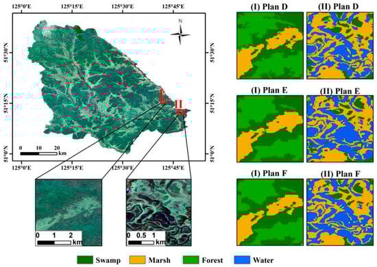 Figure 8 illustrates a meticulous comparison of the classification outcomes derived from the three object-based schemes. In Plans D and E, inaccuracies occurred where some swamps were misidentified as forests, and some marshes were incorrectly classified as water bodies. However, Plan F rectified these misclassifications, resulting in more defined wetland perimeters and a more cohesive representation of marshes and water bodies. The resulting depiction of Plan F matched the actual conditions, reflecting a noticeable enhancement in the extraction process.
