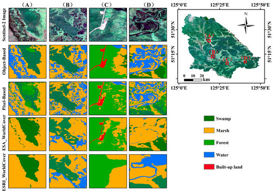 Comparison with other wetland maps (ESA_WorldCover and ESRI_WorldCover). (A–D) represent four different classification demonstration areas.