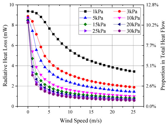 Through a series of low-pressure tests involving three thermal anemometer probes, Figure 10 shows the curves of probe output variation with wind speed under different pressures. The output signal shown represents the average of the three probes. The temperature difference ∆T between the thermal sphere and the environment was calculated using the probe’s output signal and the Seebeck coefficient of the internal thermocouple, which was approximately 0.065 mV/°C. Assuming an infrared emissivity of 0.85 for the surface of the hot sphere, the radiative heat loss could be calculated based on the temperature of the hot sphere, along with its proportion of the total heat flow. The total heat flow was determined from the hot sphere’s current of 0.056 mA and a sphere resistance of 25 Ω. Figure 11 presents the calculated radiative heat loss and its proportion relative to the total sphere heat flow.