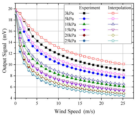 Using experimental data, probe output under 3 kPa, 5 kPa, 10 kPa, 15 kPa, 20 kPa, and 25 kPa conditions was interpolated, with the results of linear and quadratic interpolation compared to measured data, as shown in Figure 23 and Figure 24, respectively.