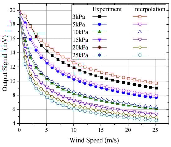 As seen in Figure 14, when the ambient pressure was above 5 kPa, the probe’s sensitivity decreased monotonically with increasing wind speed. However, the effect of pressure on sensitivity showed opposite trends at wind speeds below and above 2 m/s. At wind speeds below 2 m/s, the probe exhibited greater sensitivity in higher-pressure environments, while, at wind speeds above 2 m/s, the probe’s sensitivity decreased with increasing pressure. This behavior was primarily related to the variation in the convective heat transfer coefficient; at higher pressures, the convective heat transfer coefficient increased rapidly with wind speed, resulting in higher sensitivity at lower wind speeds. However, the temperature of the thermal sphere quickly approached the flow field temperature, causing the signal to approach saturation more rapidly, thereby reducing sensitivity at higher wind speeds. When the ambient pressure was 5 kPa or lower, the probe’s sensitivity first increased and then decreased with wind speed, with the peak sensitivity occurring around 2 m/s, 3 m/s, and 5 m/s for pressures of 1 kPa, 3 kPa, and 5 kPa, respectively. At 1 kPa, the probe’s sensitivity was lowest near zero wind speed and slightly below its sensitivity at 25 m/s, but, above 5 m/s, its sensitivity exceeded that observed under the 3 kPa to 30 kPa conditions. As shown in Figure 15, at wind speeds above 2 m/s, the output signal varied with pressure in an almost exponential manner, whereas, at lower wind speeds, the output curve exhibited more nonlinear behavior.
