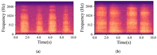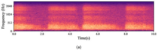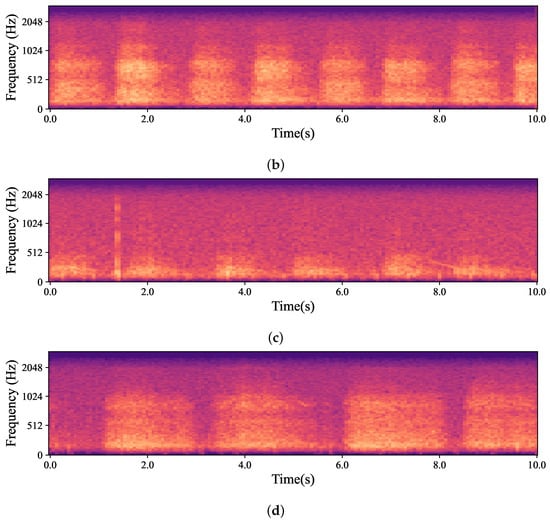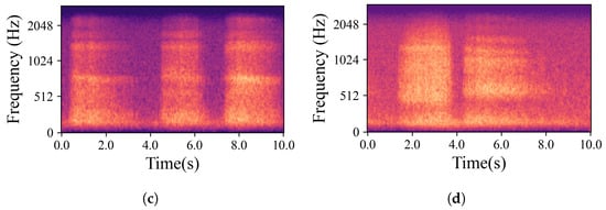 Mel-spectrogram obtained from the data captured by hearables. (a–d) show four randomly selected participants breathing normally through their noses after exercise. As depicted in the figures, each participant had a different breathing pattern, level and pace based on their physical fitness level and morphology. For example, in (b), the participant was breathing relatively fast and deeply while the participant in (c) had normal nasal breathing which was barely audible and distinguishable.