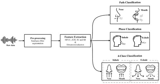 Within breathing analysis, the detection and classification of breathing path (nasal and oral) and breathing phase (inhalation and exhalation) are also of importance for diagnosis of a varied range of illnesses [16]. Mouth breathing is a voluntary and undesired way of breathing which affects the perioral muscles, tongue and cheeks [17]. Also, in [18], it was demonstrated that oral breathing can cause significant decreases in cognitive tasks, such as memory and learning capability. It is also a risk factor for dental health [18]. On the other hand, nose breathing, which is involuntary [19] and considered as “normal” breathing [20], may positively impact sleep quality, immunity, and body fat reduction [21]. More investigation in [18] shows nasal breathing causes more brain activation and connectivity compared to oral breathing.