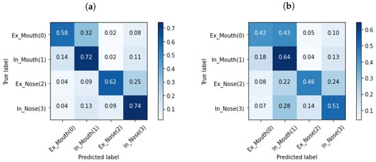 Mean confusion matrices showing four-class classifier results from using XGBoost and 200 ms segments. (a) shows the confusion matrix of Forced and (b) the confusion matrix of All. In both matrices, the confusing class was “Exhalation” showing that regardless of respiration path distinguishing exhalation from inhalation is complicated. Comparing (a,b), this gets worse when the algorithm is tested in All.