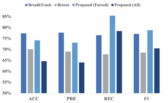 In our dataset, participants could breathe at different intervals based on their breathing patterns, and even these time intervals could vary within each breathing cycle covering a more realistic range of possible breathing patterns. Figure 8 compares the performance of our algorithm for classifying breathing phases using data collected from IEM to the performance of “Breeze” and “BreathTrack”, the two algorithms for data collected from mobile phones. Looking at the bar chart, it seems that although our algorithm’s accuracy and precision may not be as high as the other two, its recall and F1-score are much better in both the Forced and All categories. This means our model is better at identifying actual positive instances, which is crucial for medical applications and achieving accurate predictions. Although extensive research has been conducted on breathing, to the authors’ knowledge, no other literature exists classifying Nose/Mouth breathing using audio signals.