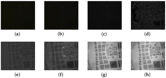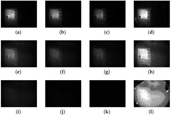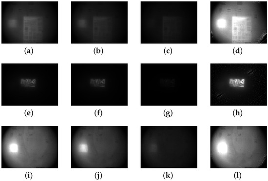 As discussed in the preceding section, the target is positioned at a constant distance from the range-gated imaging system, and polarized images are acquired at varying angles through the rotation of the polarizer. The varying levels of turbidity in the environment are achieved by incorporating different quantities of milk. By inputting mutually orthogonal image pairs acquired under different turbidity conditions, the corresponding polarization-enhanced images, as illustrated in Figure 11, can be obtained.