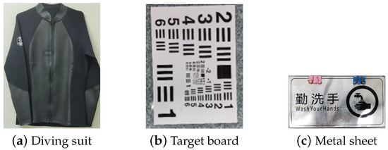 In the second phase of the experiment mentioned in Figure 4, photographs of objects located 2.26 meters away were captured in an underwater environment with a turbidity of approximately 2.67 NTU. By rotating the polarizer, we can acquire images of the objects—including metal sheets, target boards and diving suits—at polarization angles of , , and . For the range-gated imaging system, after acquiring polarization images of three targets at different polarization angles, and inputting the and images, we obtained the enhanced images of the three types of objects, as illustrated in Figure 10.