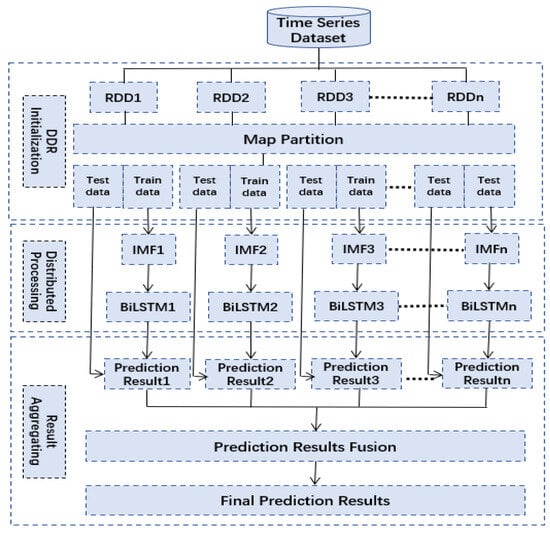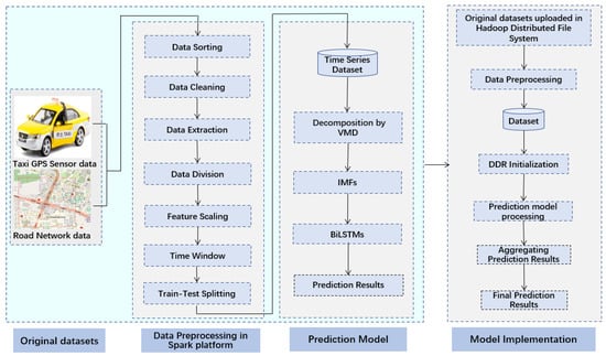 Although the taxi demand prediction problem has been addressed in the aforementioned studies, performing accurate and efficient taxi-demand prediction is still tricky, and three significant issues can be found: (1) The non-linear and non-stationary features of taxi data. The generated GPS data are different and complicated characteristics in various traffic conditions in other geographic areas and periods. Therefore, some approaches apply EMD-based algorithms [,], and some other design interpretability index and perform partial dependence analysis []. However, there is still a challenge in looking for models that can efficiently deal with non-linear and non-stationary features and provide accurate predictions for taxi demands and traffic flow. In this study, Variational Mode Decomposition (VMD) is applied to decompose time series datasets into sub-series to reduce the influence of non-linear and non-stationary features of taxi data. (2) The existence of gradient explosions, the issue of gradients growing bigger and bigger, gradient disappearance, the issue of gradients becoming smaller and smaller and approaching zero in forecasting methods, and the inability to extract time series features for specific short periods present challenges. Previous studies utilized machine learning models such as RNNs, LSTM, and GRU [,]. Although these models are well suited for modeling sequential dependencies, which are vital in traffic prediction, the BiLSTM mode is capable of utilizing information from both sides that remarkably increases the accuracy and solves the gradient disappearance issue. Therefore, BiLSTM is used in this study. (3) The traffic data are constantly increasing, and with the exponential growth of these data, existing algorithms suffer from certain limitations on the centralized mining platform. Many issues still emerge when dealing with large-scale datasets, and training predictive models is time-consuming and requires massive computational resources, leading to low prediction performance. Although some researchers [,] adopted Hadoop’s MapReduce platform for high-performance computation, the computation load was still relatively huge and requires enhancement. Our study adopted a Spark parallel framework, which can be 100 times faster than MapReduce, by applying Resilient Distributed Dataset (RDD) operators, which eliminate the need to store intermediate files, and by this method, the accuracy, efficiency, and robustness of the traffic data are highly improved.