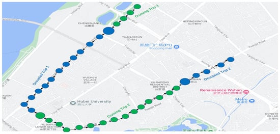 After completing the data cleaning process, the next step was to extract information about taxi trips, i.e., when taxicabs were cruising the city roads with passengers. This information could be obtained by analyzing the taxi status recorded in the GPS sensor dataset. Specifically, if the taxi status of a taxicab is 1, it indicates that no passenger is in the taxi at that moment. On the other hand, once the taxi status is 3, it signifies that the taxi is occupied with passengers, as depicted in Figure 3.