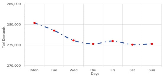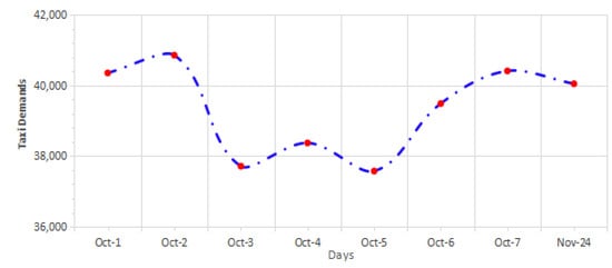 Regarding the distribution of taxi demand on holidays, the gathered dataset included eight days (Chinese National day holiday on 1–7 October and 24 November for Christmas day). The distribution of taxi demand on holidays for the target area is illustrated visually in Figure 6.