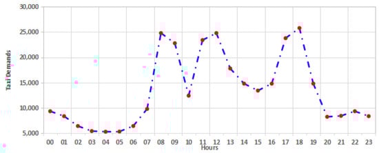 Figure 7 shows the average distribution the taxi demands over 24 h in the target area in Wuhan City, China.