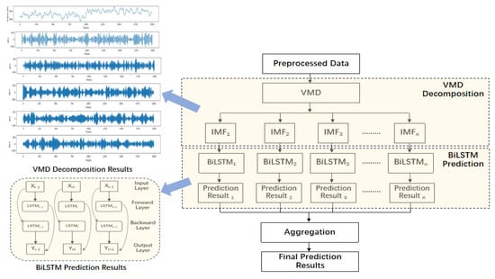 VMD technology adeptly deals with non-linear and non-stationary signals, circumventing the issues of spurious components and edge effects, showing exceptional signal processing abilities. BiLSTM explores information from both the past and future at specific time intervals. The bidirectional approach allows the network to capture features more fully and improve its predictive performance. By merging the advantages of the data decomposition method and a deep learning model, the hybrid model presented in this study can significantly enhance the accuracy and reliability of taxi demand prediction. The overall diagram of the proposed model is shown in Figure 8.