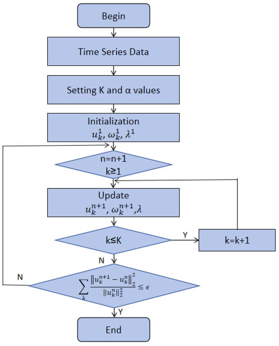 The VMD algorithm utilizes a frequency division process that considers the characteristics of the given signals and continuously updates each intrinsic mode function (IMF) and their central frequency. A flowchart of the VMD algorithm is shown in Figure 9.