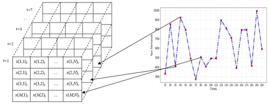 Following the time window designing method in [], a time window set can be generated from the dataset by periods as follows: t−7, t−6, t−5, t−4, t−3, t−2, t−1, and t, where each time interval period can be defined by exploring the optimal prediction horizon (can be 5, 10, 15, or 20 min). The time window step resulted in taxi demands for the time intervals which later would be the inputs fed into the proposed model to attain the prediction results for the next period t+1.