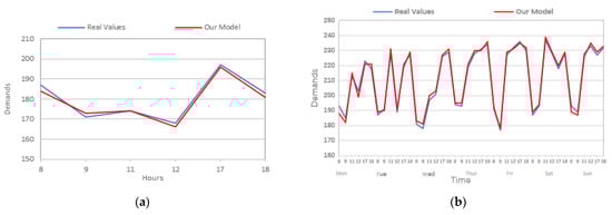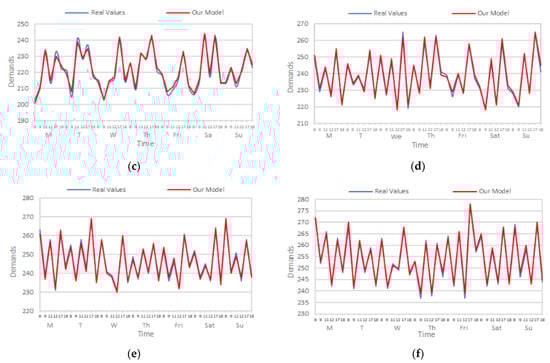 The results presented in Table 6 show that our model generated the smallest error among all predictions, as the VMD and LSTM methods have a better ability to map taxi demand data from the target study area and benefit the most from the spatial and temporal features for demand prediction, thereby resulting in perfect prediction performance. In addition, when we consider the 5 min time interval as the essential period, the MAE, MAPE, and RMSE had the smallest values by remarkable percentages as well. Therefore, we utilized a 5 min interval as the main reference for the temporal prediction horizon for this study.