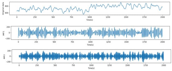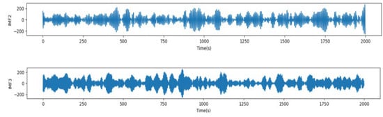 A Variational Mode Decomposition method is an adaptive signal decomposition method proposed by Dragomiretskiy and Zosso []. VMD utilizes a non-recursive base signal decomposition method. The VMD algorithm decomposes the target signal into K Intrinsic Mode Functions and then obtains a mean frequency of each IMF. Consequently, a mode uk fluctuates around its respective mean frequency ωk.
