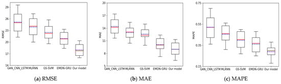 To further illustrate the experimental results with the Wuhan dataset, Table 7 provides a comprehensive overview of the model performance across different time intervals, including one day, one week, two weeks, one month, two months, and the entire dataset. The box-plots offer a concise summary of the model’s performance, showcasing the variability and distribution of the MAPE values for each time interval. When considering the entire dataset, our proposed model demonstrates significant improvements over other models in the obtained results for the MAPE, RMSE, and MAE. Specifically, our model achieves a MAPE value that is 52%, 43.2%, 44.95%, and 48.01% lower than that of GAN_CNN_LSTM, MLRNN, GS-SVM, and EMDN-GRU, respectively. This indicates a substantial reduction in the prediction error compared to the alternative models.
