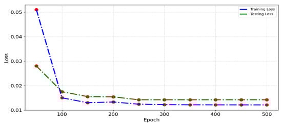Figure 17 depicts the loss function for the distributed VMD-BiLSTM model when trained and tested on the whole Wuhan dataset within a five-minute period. The graph covers different epochs ranging from 50 to 500. The training and testing processes of the proposed model demonstrated noteworthy consistency between the training loss and the testing loss.