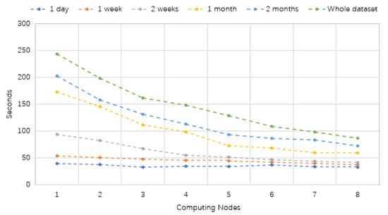 From Table 9 and Figure 18, we notice that especially for the small files (one day and one week), the total execution time is almost the same. Additionally, regarding massive files, although the running time for conducting traffic predictions begins with high costs (above 150 s), the required time consumption is reduced sharply with the rise in the number of computing resources from three to eight.