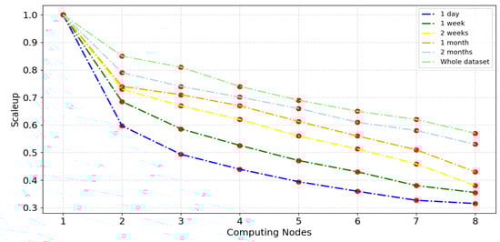 The scaleup metric serves to assess the performance of a target model when handling larger datasets in the presence of additional computing nodes (computing cluster sizes). To analyze the scalability metric of VMD-BiLSTM, experiments were conducted by gradually increasing the number of nodes, from one to eight active Spark slaves, as a direct proportion of the dataset sizes. The datasets used for this evaluation varied in size, ranging from smaller datasets (1 day and 1 week) to larger ones (2 months and the entire dataset). Each experiment was repeated three times to guarantee the accuracy of the findings. The results of these experiments are plotted in Figure 19 for the Wuhan dataset. The figure provides visual representations of the scaleup performance of the VMD-BiLSTM model under different dataset sizes and computing node configurations.