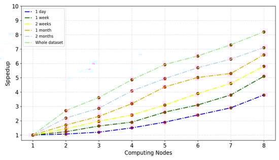 From Figure 20, it is evident that the speedup of the VMD-BiLSTM model exhibits a relatively linear increase as the number of computing nodes grows. Notably, larger datasets tend to achieve a better speedup. In particular, the speedup value with the largest amount of data reaches 8.123, which is close to the ideal speedup, when utilizing eight nodes. Achieving linear speedup is challenging due to factors such as communication costs and imbalances among the slave nodes []. Furthermore, the results highlight that as once data size gradually increases, the computation time becomes remarkably dominant.