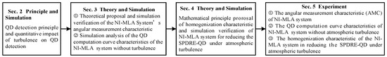 The outline of this paper is shown in Figure 1. Specifically, Section 2 briefly analyzes the basic principles of QD spot position detection and simulates the impact of varying turbulence intensities on QD detection. Section 3 and Section 4 analyze, from theoretical and simulation perspectives, the AMC and QD computation curve characteristics of the NI-MLA system (Section 3), as well as its capability to mitigate the turbulence-induced SPDRE-QD (Section 4). In Section 5, the experimental results are provided. Conclusions are drawn in Section 6.