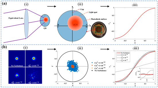 Before studying the atmospheric turbulence’s influence on QD, the working process of QD is illustrated. Figure 2a illustrates the measurement principles of the quadrant detector (QD). Specifically, part (i) shows the fundamental operating state of the QD with an optical lens placed at the focal plane of the QD, aligning the beam’s angle of incidence with the system’s optical axis to correspond to the QD’s spot position. Part (ii) displays the basic structure of the QD, which consists of four symmetrically arranged p-n junctions around a central point. Each segment of the detector converts the incident light into a proportional current. The beam position is estimated using the “Δ/Σ” formulas, as shown in Equation (1) [11].