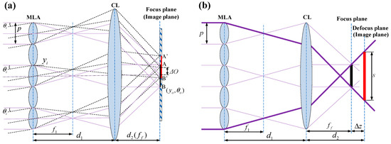 To verify the AMC of the NI-MLA system, the ABCD matrix is utilized in geometric optics to derive the relationship between the height of the image plane ray and the incident angle under paraxial approximation conditions [19]. Also, the focal length analytical formula of the NI-MLA system under general conditions is derived in this subsection. As shown in Figure 3a, the NI-MLA system consists of the MLA with sub-apertures (size p, focal length ) and a condenser lens (CL) with a focal length of . The distance between CL and MLA is, and the separation between CL and the image plane is . and represent the beam’s incident height and angle, respectively, while and represent the beam’s height of image plane and outgoing angle, respectively, which are collectively represented by the beam vector O. The m indicates the sequence of MLA sub-apertures (the position of the central sub-aperture is m = 1).