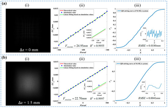 Simulation of the AMC and QD computation curve of the NI-MLA System. (a) Part (i) represents the spot image on the QD target surface when Δz = 0. Part (ii) represents the relationship between and , calculated from the spot energy distributions shown in part (i) using Equation (6) when Δz = 0. Part (iii) represents the QD computation curves corresponding to the spots in part (i), calculated using Equation (1) when Δz = 0. (b) Part (i) represents the spot image on the QD target surface when Δz = 1.5 mm. Part (ii) represents the relationship between and , calculated from the spot energy distributions shown in part (i) using Equation (6) when Δz = 1.5 mm. Part (iii) represents the QD computation curves corresponding to the spots in part (i), calculated using Equation (1) when Δz = 1.5 mm.