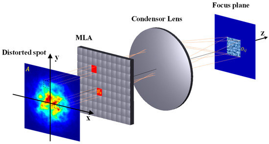 where is the energy value of each sample point of the spot, is the average value of the sample points, and N represents the number of sample points. Essentially, the luminous flux contrast C is given by , which is the coefficient of variation of the matrix. Specifically, it is demonstrated that the NI-MLA system can reduce the luminous flux contrast of the spot energy distribution to illustrate its capability to enhance the uniformity of the spot energy distribution (the smaller value of C, the higher the uniformity of the spot). As shown in Figure 5, the intensity distribution of the original incident beam is represented by a matrix A (pseudo color image represents the energy distribution of incident turbulent light spot) with a size of . The MLA divides A into sub-matrices , with the size (). The condenser lens then superimposes these sub-matrices to form a matrix O (intensity distribution of focal plane spot) with the same size of . The distribution of O is given by:
