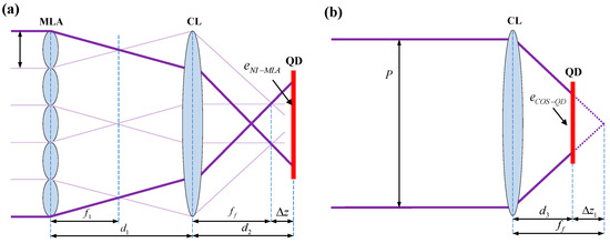 Schematic diagram of NI-MLA system. (a) The image plane (QD target surface) is located at the focal plane of CL. (b) The image plane is located at the defocus of CL.
