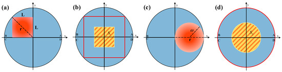 The best matching scheme for spots generated by NI-MLA and COS-QD with the QD. (a) The size relationship between the square Spot and QD. (b) The computation range of the square spot on QD. (c) The size relationship between the circle spot and QD. (d) The computation range of the circle spot on QD.
