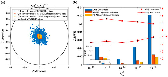 Based on the parameters in Table 1 and Table 3, as well as applying Equation (1) to solve and , and using as a demonstration example, Figure 8a shows the QD computation errors of the two optical systems under strong turbulence conditions. It can be observed that the position distribution of the distorted spots modulated by the NI-MLA system and computed by the QD (orange and red scatter points) is more concentrated than the COS-QD (blue scatter points). Specifically, the RMSE of the QD computation values is calculated in the x-axis direction, , for (Corresponding to the orange, yellow, and blue bar charts in Figure 8b with a horizontal axis of , respectively). This simulation results indicate that under strong turbulence conditions, the NI-MLA system outperforms the COS-QD in mitigating the SPDRE-QD.