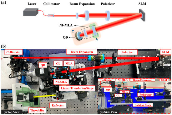 The diagram and photography of the experiment are shown in Figure 9. A laser with a wavelength of 632.8 nm is emitted from the collimator (, NA = 0.50 FC/PC) at a power of 400 μW, which maintains a high signal-to-noise ratio for the QD without saturation. After a segment of free-space transmission, the beam is expanded and polarized before being incident at a certain angle onto the center of the liquid crystal spatial light modulator (SLM, 1920 × 1080, 8 µm, 6π, 60 Hz). The phase modulation capability of this device is used to simulate the wavefront of the beam passing through atmospheric turbulence. The modulated laser beam is incident on the NI-MLA system, sequentially passing through the MLA (parameters as shown in Table 1) and a focusing lens () and then focusing on the QD target surface (radius 5 mm, resolution 0.7 µm). The actual displacement of the spot is measured and recorded by the piezo stage (resolution 3 nm) below the QD. The output voltage from each quadrant of the QD is collected by an analog-to-digital converter and analyzed by a computer to give the computed position of the spot. In the NI-MLA system, CL and MLA are each fixed on five-axis adjustment stages to ensure accurate alignment of the optical components with QD. As shown in Figure 9b, the QD and NI-MLA system are placed as a whole on the azimuth rotation stage (represented by the pink block in Figure 9a), and the system’s rotation angle is accurately measured using a theodolite (resolution of 2.5 urad). In addition, in order to enhance the system’s flexibility and adjustability, the MLA can be laterally moved out of the optical path using a horizontal linear translation stage (represented by the green block in Figure 9a), allowing for easy conversion from the NI-MLA system to the COS-QD.