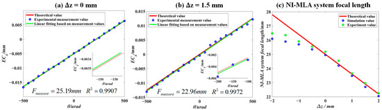 Figure 10a,b shows the relationship curves between and for the NI-MLA system at different defocus positions. The green lines are obtained by the first-order linear fitting of the measured value of (blue scatter points). The goodness of fit R2 is greater than 0.99 when the changes in the range of 1 mrad (due to the measurement error of experimental instruments such as theodolite and the manufacturing error of experimental devices such as the NI-MLA system, the R2 in the experiment is lower than the simulated value). The above results show that within ±500 µrad, there is a linear relationship betweenand, demonstrating that the NI-MLA system possesses the AMC. As shown in Figure 10c, the variation in the focal length of the NI-MLA system is investigated when the QD target surface is at different defocus positions, and the range is set from −2 mm to 2 mm, in an increment of 0.5 mm. Other parameters are listed in Table 1. The theoretical values, simulated values, and experimental measurements of the NI-MLA system’s focal length are represented by the red line, blue circles, and green circles in Figure 10c, respectively. It can be observed that although the experimental measurements of the system’s focal length are closer to the theoretical values than the simulated values in some defocus, the simulations show the same trend as the experimental measurement. This indicates that compared with the theoretical values obtained by geometric optics, the focal length simulated results obtained by Fourier optics considering the MLA aperture diffraction effect are closer to the measured focal length of the NI-MLA system in the change trend, which reflects the accuracy of the simulation model in simulating the NI-MLA system. At the same time, it can be observed that when ∆z < 0, the difference between the theoretical, simulated, and experimental values is relatively large. However, when ∆z > 0, the difference is smaller. This discrepancy can be attributed to the difference in spot uniformity when the NI-MLA system focuses in front of or behind the focal plane. When the focus is in front (∆z < 0), the spot uniformity is lower compared with focusing behind (∆z > 0), resulting in a larger deviation in the spot’s centroid position when the incident light is tilted at a certain angle.