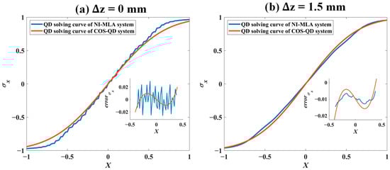 In Figure 11, the curve characteristics of the NI-MLA system (corresponding to, and values at and in Table 4) align with the simulation results (Table 2) in parts (iii) of Figure 4a,b, which confirms the conclusion in Section 3.2 that “In the NI-MLA system, the QD computation curve characteristics can be optimized by appropriate defocus”. As for the QD computation curves and their characteristics of the COS-QD (corresponding to , and values at and in Table 4), it can be observed that at and , the and of the NI-MLA system are inferior to those of the COS-QD, while at the defocus of the NI-MLA system, that is, and , the , , and of the NI-MLA system are superior to those of the COS-QD.